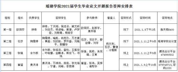 为落实学校毕业论文工作的要求,确保2021届毕业论文的开展进度和撰写质量,在加强疫情防控工作的要求下,瑶湖学院于1月8日—1月11日以线上和线下的方式举行了2021届毕业生论文开题报告答辩。学院领导、各专业毕业论文指导老师、2017级所有学生参加了本次开题报告答辩会。