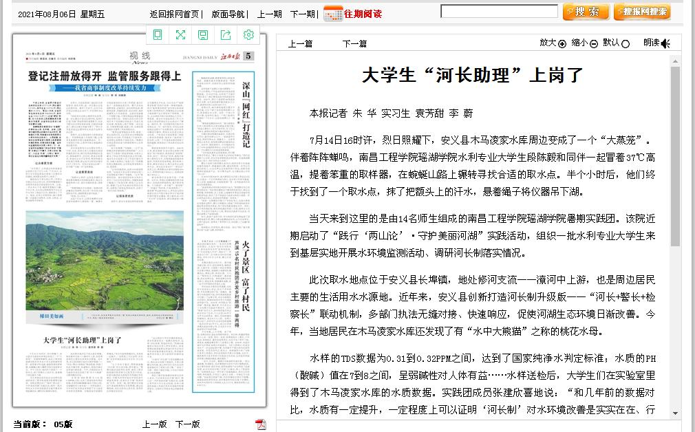 8月6日,《江西日报》以《大学生“河长助理”上岗了》为题,报道了瑶湖学院暑期三下乡社会实践活动。