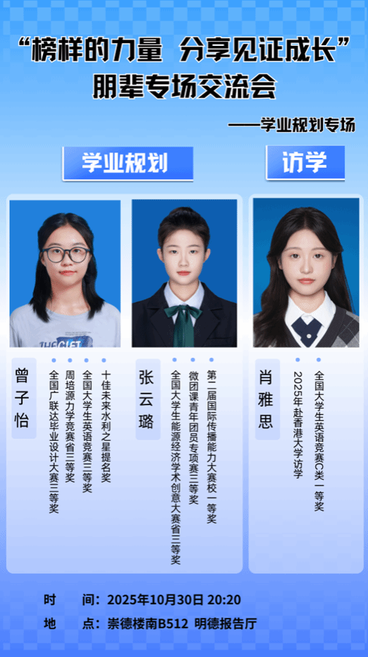 为助力2025级新生顺利适应大学生活、拓宽信息视野,并缓解对未来发展的焦虑与迷茫,瑶湖学院于10月30日在明德报告厅隆重举办了“榜样的力量 分享见证成长”朋辈专场交流会。本次活动邀请曾子怡、张云璐、肖雅思三位优秀学生代表进行分享,2025级全体新生参与。