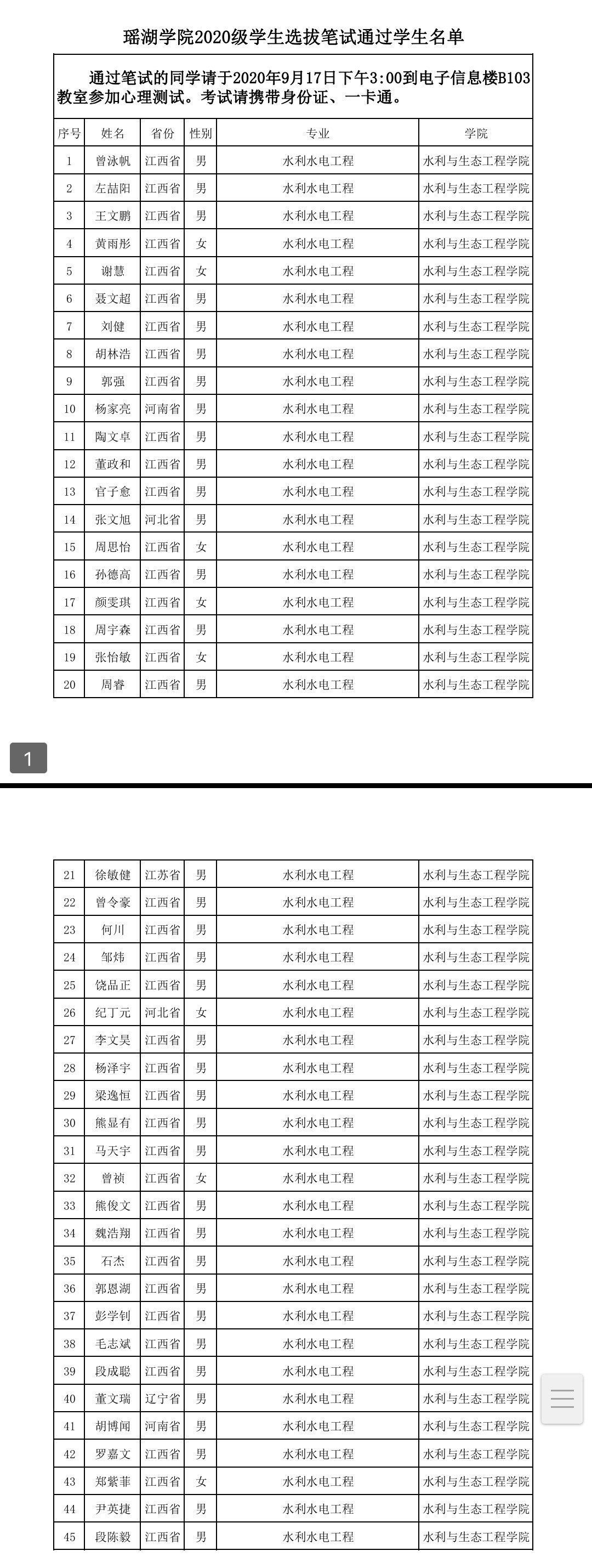 瑶湖学院2020级学生选拔笔试通过学生名单公布如下