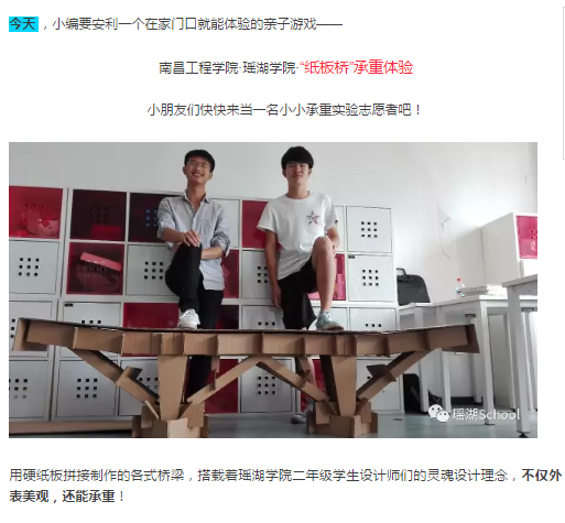 该活动由南昌工程学院瑶湖学院主办,活动全程免费!还能体验除“纸板桥”承重试验以外的丰富活动。