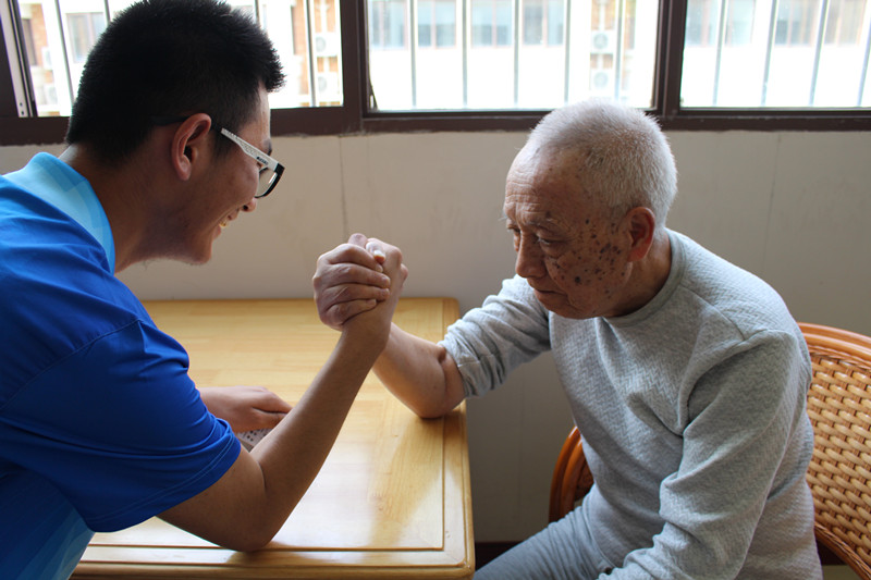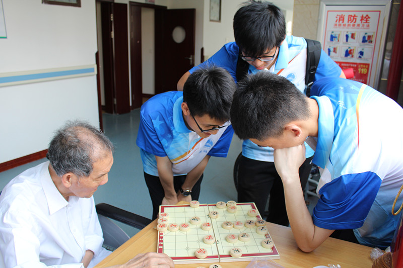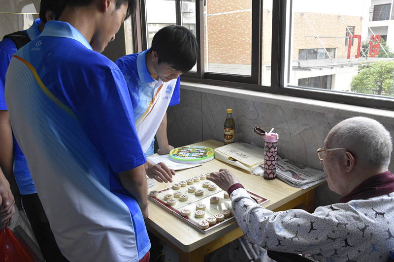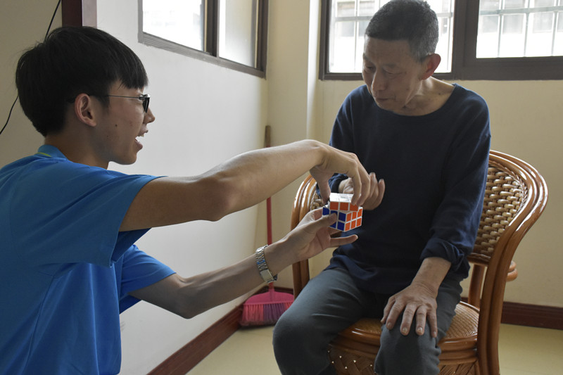 而后志愿者们分成两队,一队教老人玩魔方、下象棋,另一队陪老人聊天、掰手腕、散步等。