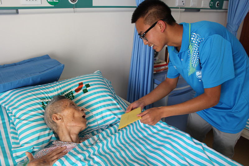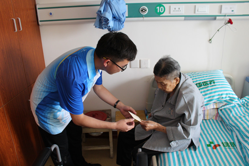 志愿者们到达青山湖区社会福利中心后,首先为这里的奶奶们一一送上他们精心准备的写有母亲节祝福的贺卡。