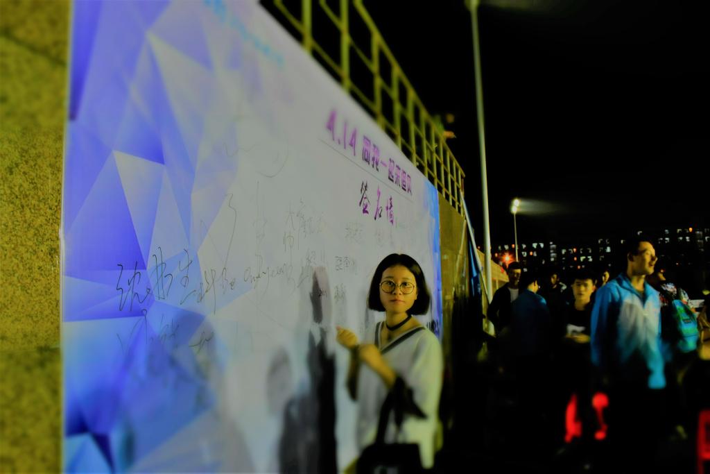 经过前期的宣传推广工作,14日晚到场参与夜跑开幕式的同学不下40人。他们在签名墙前签下了自己的名字,今后夜跑便和匹配到的搭档一起,坚持锻炼,形成互相监督互相进步的锻炼氛围。