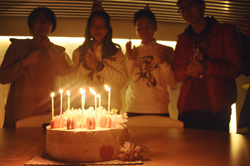三月份的这场生日趴主要为六位寿星举办,可惜的是只有三位到场参与我们为他们举办的生日趴中,不过这一点也不影响我们的热情(寿星再多点的话,奶油可根本不够用)。随着灯光的一盏盏熄灭,整个博学堂只剩背景板和烛火散发着柔和而并不微弱的光,同学们在烛光前围成一圈,向着蜡烛(蹭着寿星的福气)许愿。据说许的愿说出来就不灵了,所以我才不会告诉你们我的愿望就是分到最大的那块蛋糕!