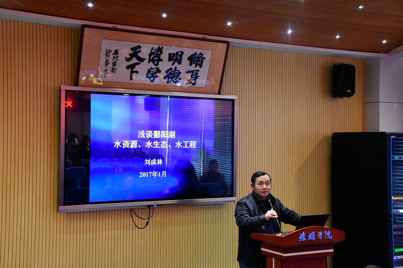 1月13号上午,南昌大学水利系副主任刘成林教授应邀作客明德讲堂,作了为题《浅谈鄱阳湖水资源、水生态、水工程》的学术报告会。会上刘教授分析了有关鄱阳湖的水资源、水生态与水工程的情况,并从社会影响、经济影响和政治影响三大方面展开,从鄱阳湖水资源安全、分配和演变遇到的问题入手,讲述了在这个过程中所要面临的各种挑战。刘教授的演讲开拓了同学们的水利视野,引发了同学们的深思。