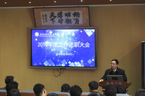 会上,瑶湖学院行政教师向全体师生作了述职报告。报告总结了瑶湖学院从成立至今开展的主要工作、推行的创新举措、发生的重要事件,以及取得的成效和存在的不足,并对2019年工作提出了计划。