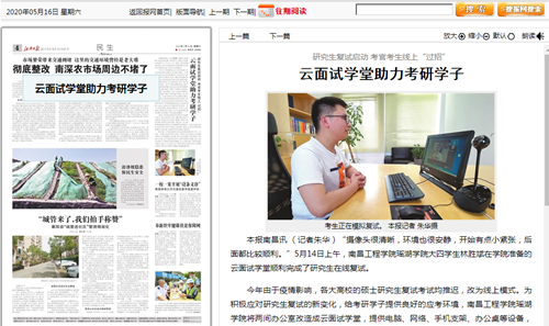 5月16日,江西日报和江西新闻网分别在重要版面以“研究生复试启动 考官考生线上过招——云面试学堂助力考研学子”为题,报道了我校瑶湖学院在疫情期间倾力打造“云面试学堂”,助力学生考研复试,以及学生在云面试学堂参加面试的感受与收获。