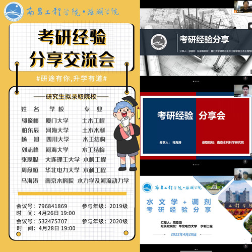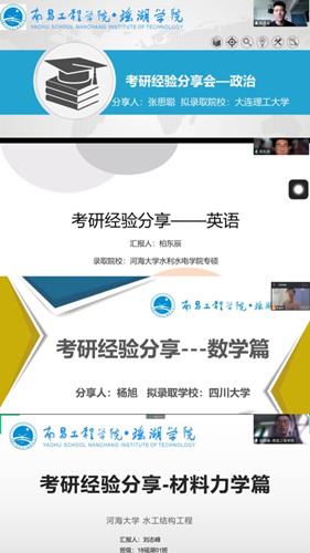 交流会上,七位成功考取研究生的2022届毕业生就院校选择、时间安排、方法技巧和心态调整等多个方面进行了分享,并为即将踏上考研征程的低年级同学答疑解惑。以政治单科81分考入大连理工大学水利工程专业的张思聪分享了政治复习备考方法并对考研过程中心态调整提出了建议;以英语单科88分考入河海大学土木水利专业的柏东辰讲述了英语学习的小妙招;成功考入四川大学水工结构专业的杨旭分享了考研数学的复习方法和考研学习时间统筹与安排;以专业课接近满分成绩考入河海大学水工结构专业的刘志峰就考研复习材料准备和专业课程复习畅谈了体会;以总分376分考取厦门大学土木工程专业的邬晓彬讲述了自己在考研目标确定、心态调整和学习安排等方面的方法策略;通过参加南京水利科学研究院暑期夏令营获得优秀学员提前锚定目标院校的马海涛,对科研院所与普通高校做了比较分析;以不占优势的分数成功调剂到华北电力大学土木水利专业的周意恒分享了自己的报考和调剂经验。在互动交流环节,低年级同学热切提问,大四同学和与会老师耐心细致地为他们解答,整个“云端”分享交流会气氛热烈。