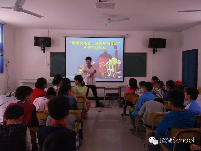 志愿者们与三、四、五年级的同学在教室上课,六年级的同学们在多媒体教室用做好的ppt给同学们上课。在四年级的教室里,志愿者分别介绍了自己,并给自己取了可爱的昵称,比如“坚果哥哥”、“婷婷姐姐”...每个组员分别给同学讲了有关自己健康饮食的小故事,向同学们科普“远离垃圾食品”的知识,并以游戏的方式考验同学们的记忆能力,游戏中被惩罚的同学们唱了自己喜欢的歌,背了自己擅长的古诗,几乎每个人都在大家面前展现了自己的特长,同时也收获了满满的知识;在三年级的教室里,大哥哥大姐姐们教小朋友们唱了健康生活的英文歌,教他们玩了识别垃圾食品的游戏;志愿者和五年级的同学们普及了垃圾食品对身体的坏处,告诉孩子们哪些食品有益健康,并在操场上教孩子们健康的生活方式;在多媒体教室里,六年级的同学们用ppt的形式给小朋友们上了一堂生动的“垃圾食品与健康”课,给小朋友们普及了健康生活的小知识,并且,课堂中他们玩起了游戏,多媒体教室里好不热闹,被惩罚的同学在地上做起了俯卧撑。
