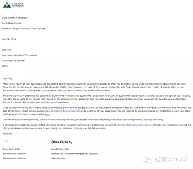 为积极推进我校教育教学改革,加快教育国际化进程,开拓学生的国际视野,提高学生的英语水平和综合素质,我校瑶湖学院积极探索学生个性化、国际化培养模式,认真组织了优秀学生参加昆山杜克大学第二校园国际化学习项目选拔。近日,在昆山杜克大学获悉,瑶湖学院15级学生樊翌佳经过自主申请、国内教授推荐、英语短文撰写评审、国外教授面试考核等环节,成功考取昆山杜克大学第二校园国际化学习项目,并将获得奖学金。
