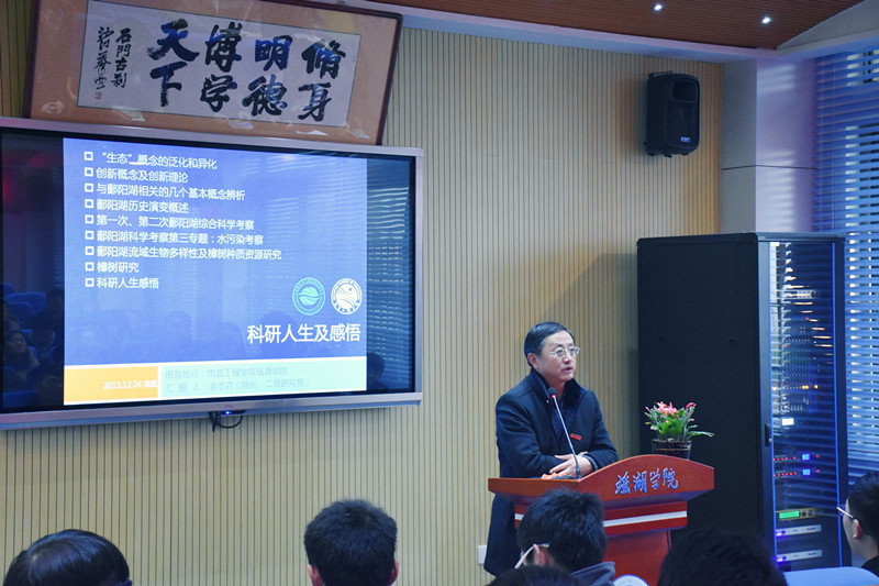 金志农围绕“生态”概念的泛化和异化、创新概念及创新理论、与鄱阳湖相关的几个基本概念辨析、鄱阳湖历史演变概述、第一次和第二次鄱阳湖综合科学考察、鄱阳湖科学考察第三专题:水污染考察、鄱阳湖流域生物多样性及樟树种质资源研究、樟树研究等八个方面,用幽默的语言、生动的画面,为师生呈现了一场精彩的报告。