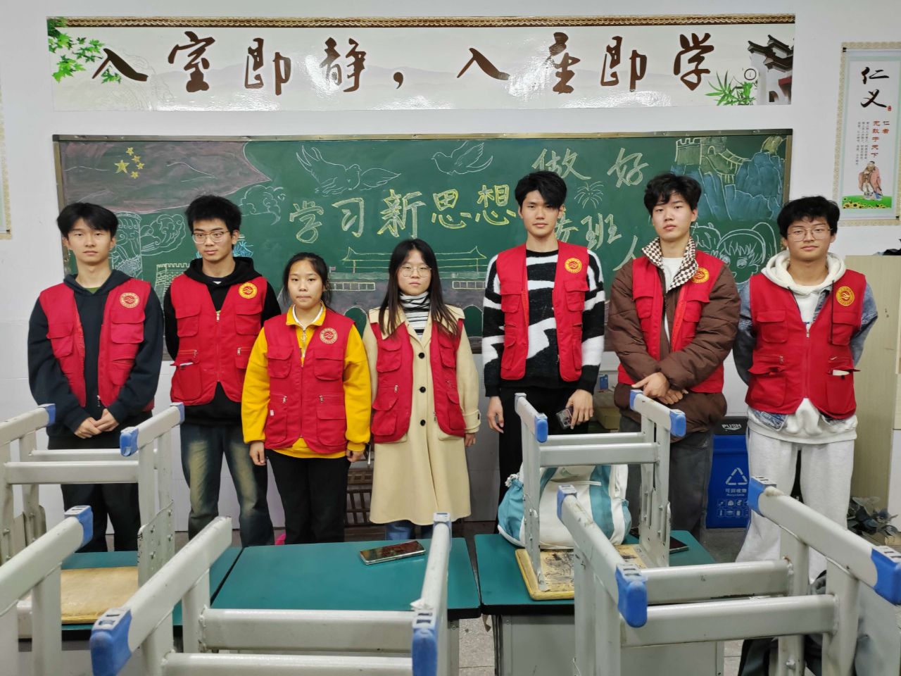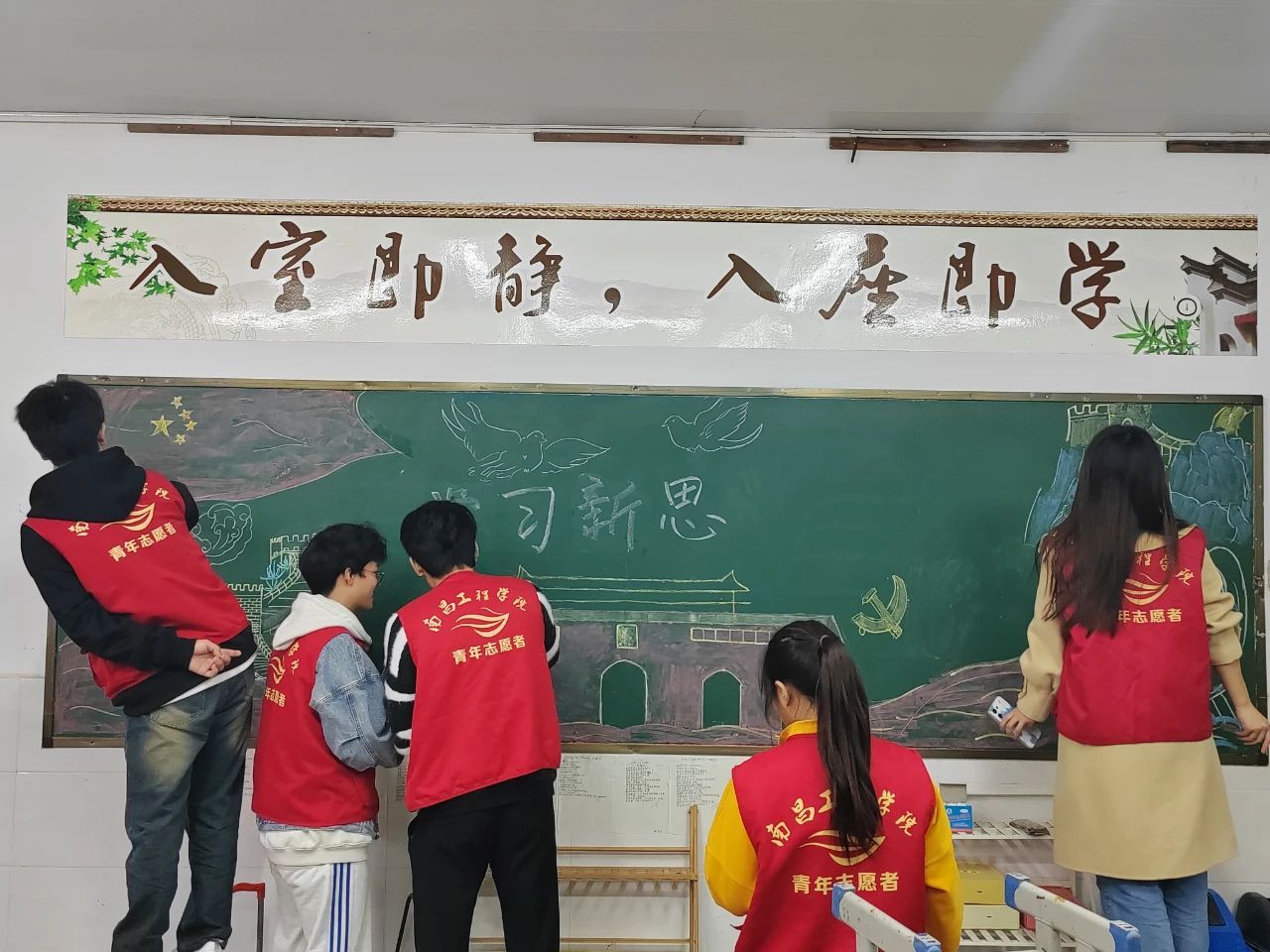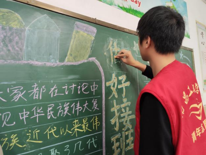 为鼓励青年志愿者亮明身份、树好形象、主动担当、敢于作为,充分发挥先锋模范作用,以青春之名,助力祖国未来成长。在孩子们离校后,瑶湖学院组织22级工科实验2班团支部前来“接力”。为小朋友们带来了“学习新思想、做好接班人”的黑板报。志愿者们首先进行了分组、分工工作。随后,各组志愿者前往各个教室开始黑板报的创作。在这个过程中,大家积极讨论、互相交流,认真地对待着手中的一笔一划,最终为小朋友们绘制了三幅精美的板报。