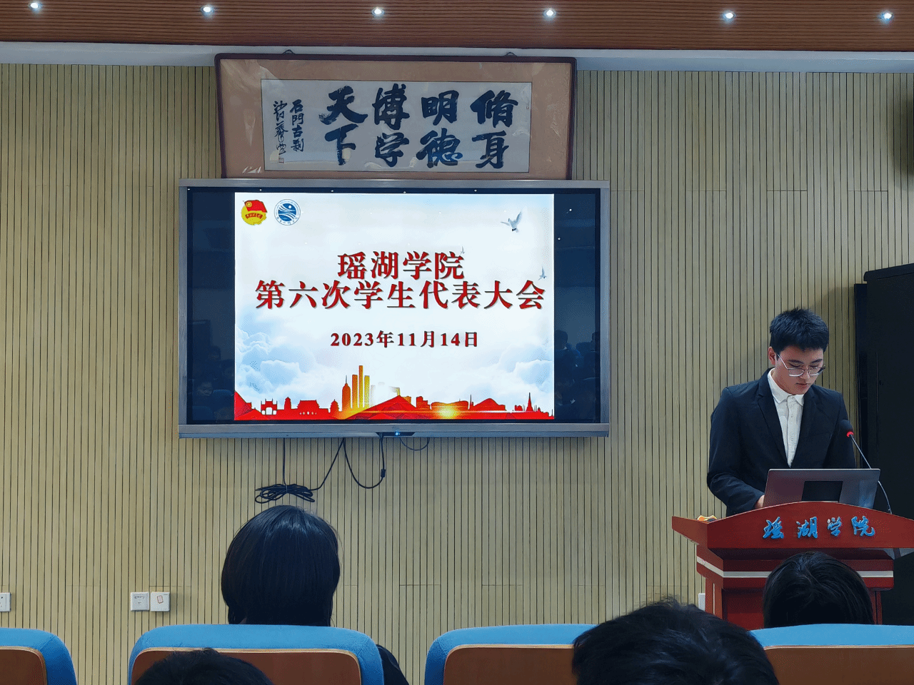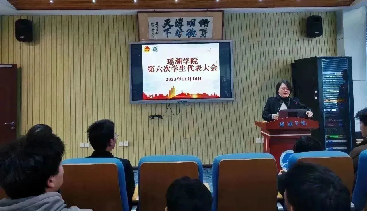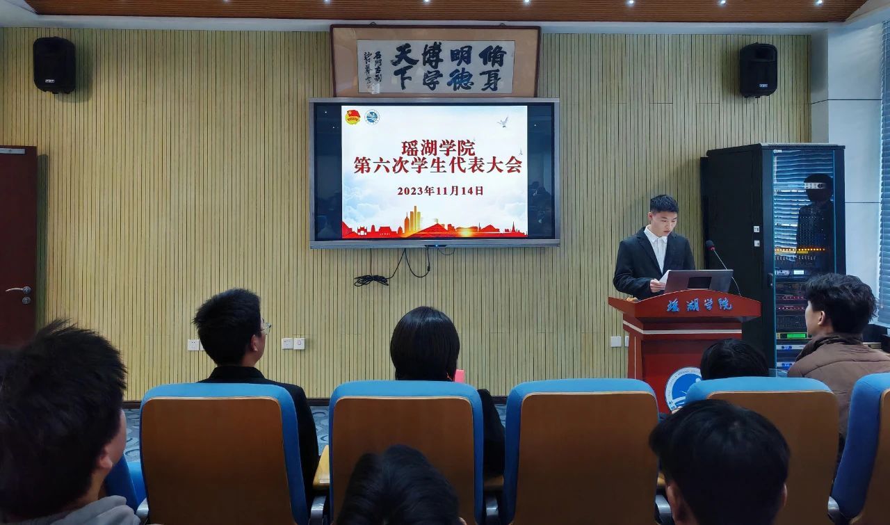 2023年11月14日,瑶湖学院第六次学生代表大会于明德报告厅举行。分团委副书记兼学工办副主任张雯雯、分团委学生副书记李文昊、校学生会主席团成员王荣恒、瑶湖学院第五届学生会执行主席胡博闻、第五届学生委员会委员以及各班级学生代表参加了此次大会,会议由储谟淦同学主持。