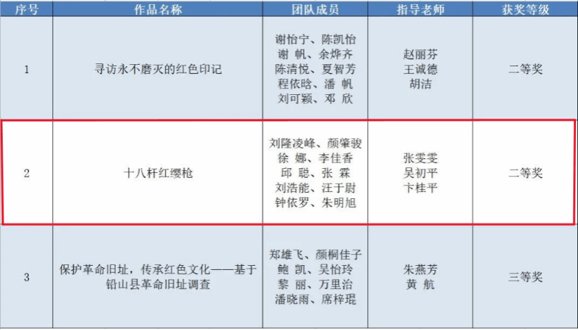 近日,由共青团中央、中国科协、教育部、中国社会科学院、全国学联和贵州省人民政府共同主办的第十八届“挑战杯”全国大学生课外学术科技作品竞赛终审决赛在贵州大学圆满落幕,我院2020级瑶湖2班刘隆凌峰、2021级瑶湖2班颜肇骏、2021级瑶湖2班张霖、2022级瑶湖1班刘浩能、2022级瑶湖2班钟依罗参与的《十八杆红缨枪》项目荣获红色专项活动二等奖。