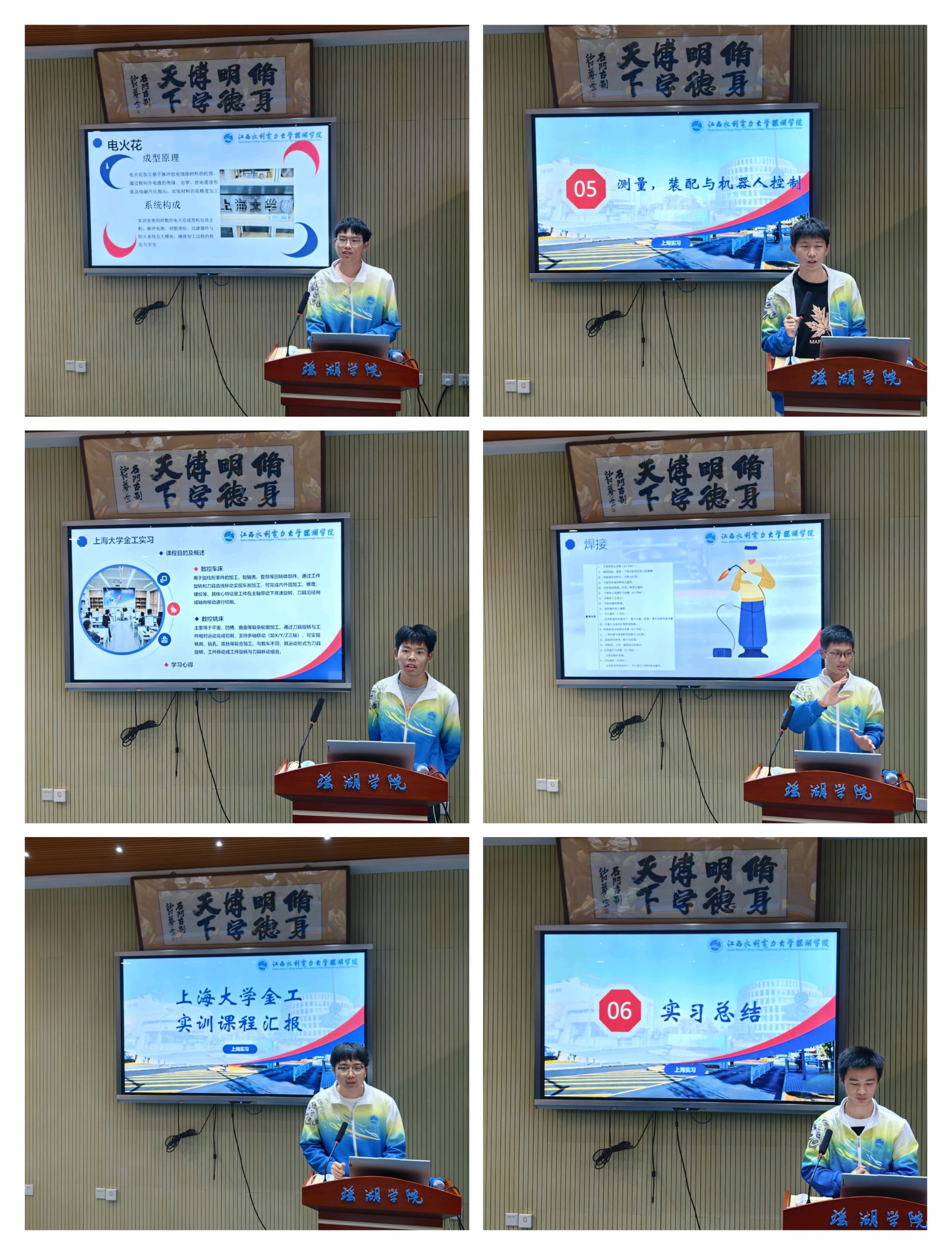 岳倩菲等代表分组进行了学习成果汇报。班长邹鑫分享了在上海大学的学习感悟,表示上海大学的实训设备和教学模式让大家突破课本局限,理解工艺优化的重要性。汇报会后,全体人员前往学院大厅观看了学习作品成果展,精美的作品展现了同学们的专业技能和创新思维。