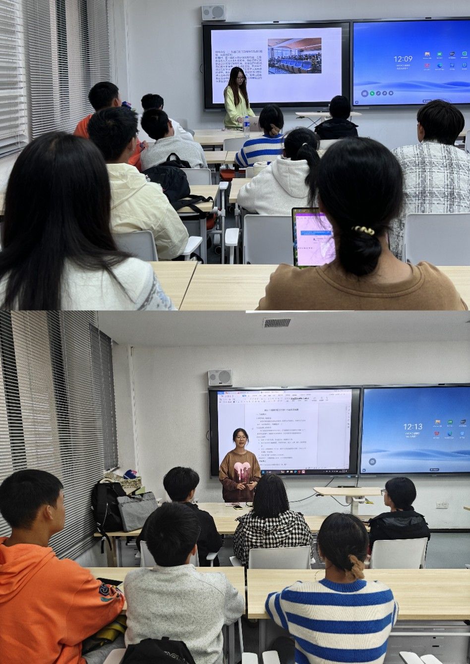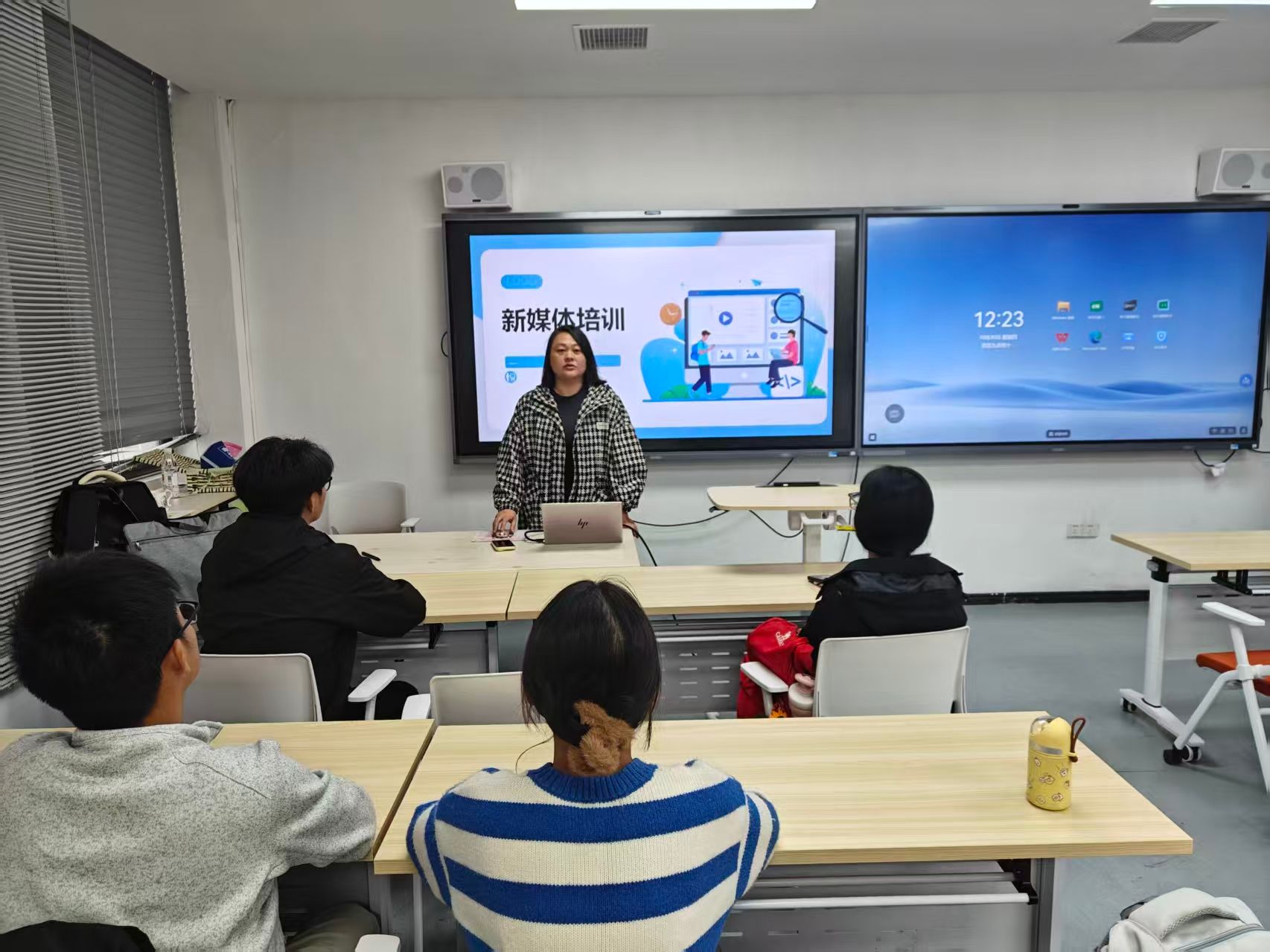 新媒体部部长肖雅思和宣传部部长邓慧先后讲述了部门的工作标准和流程。肖雅思就拍摄技巧进行讲解,结合学院内具体位置,介绍了拍照点位选择、构图要点,以及拍摄的注意事项。邓慧对撰写新闻稿的写稿要求和排版格式进行了系统讲解,强调了新闻稿的时效性与准确性,明确了标题、主体、结尾各部分的写作规范。