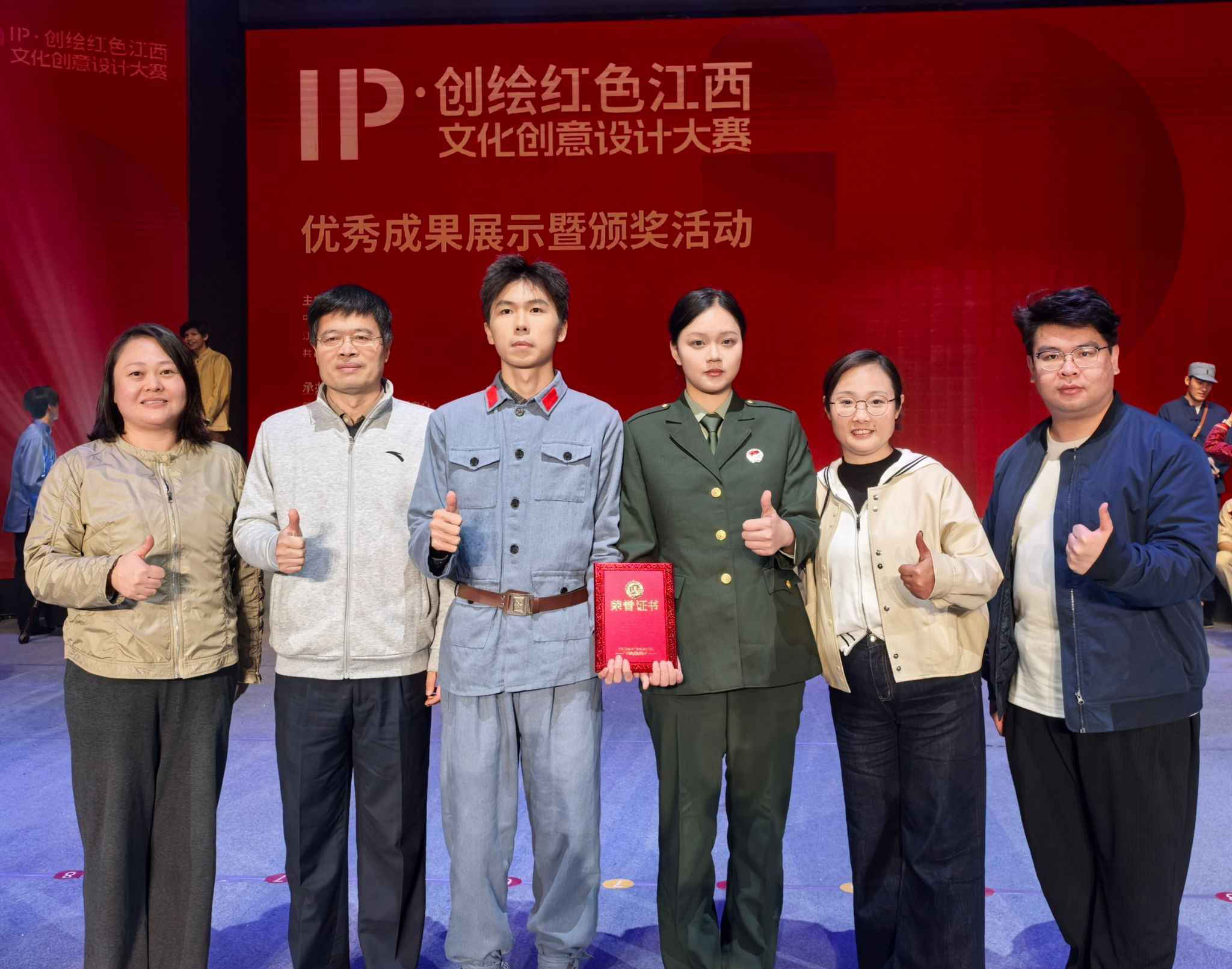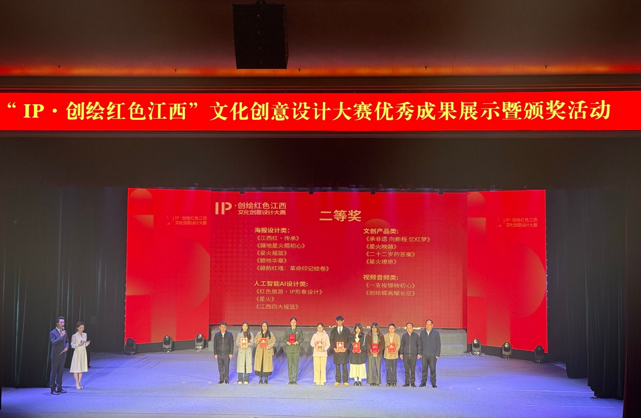 2025年11月28日,“IP·创绘红色江西”文化创意设计大赛优秀成果展览展示活动在江西科技师范大学圆满举行。本次活动由省委宣传部、省文旅厅、团省委联合主办,以“铭记·传承·创新”为主题,通过优秀成果巡展、颁奖仪式等环节,深化红色基因传承与版权保护理念。我院作为获奖作品代表应邀参加并进行现场展示,学院党总支副书记张晓航、24工科试验01班学生岳倩菲等十余名师生代表参加活动。