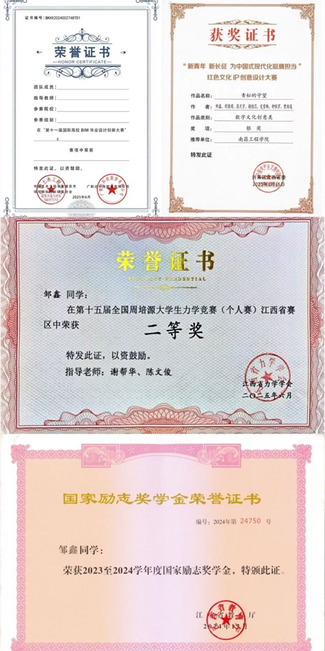 在学习中,他积极向上,勤奋刻苦。他在各个学期均获得校一等优秀学生奖学金,并在2023年至2024学年中荣获国家励志奖学金,2024年至2025年荣获国家奖学金。他也积极参加各种学科竞赛,荣获了“第11届国际高校BIM毕业设计创新大赛”二等奖,“第十五届全国周培源大学生力学竞赛”全国优秀奖,“第十五届全国周培源大学生力学竞赛”江西省二等奖“红色文化IP创意设计大赛”银奖等。