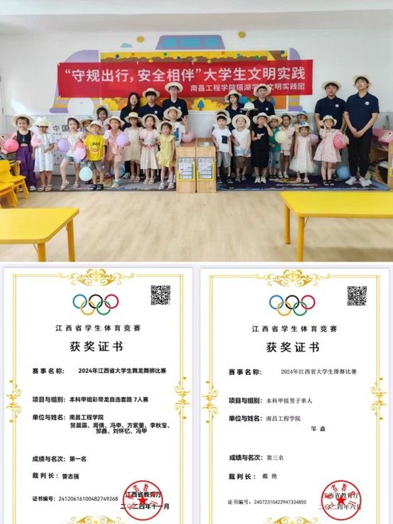 在生活中,他文体兼修,勤于锻炼。他不仅积极负责与校外的南昌德明公益服务发展中心、南昌青云谱区天同医养院联络,多次参加志愿活动,荣获多个志愿服务证书,而且也十分注重自己的体育锻炼。运动于他而言,不是一时的热血,而是长久的习惯,舒展的筋骨、有力的脉搏,皆是他深耕体能的最好见证。在日复一日的努力中,他也荣获了多项体育赛事的奖项,包括“江西省大学生舞龙舞狮比赛(本科甲组彩带龙自选套路7人赛)”第一名,“2024 年江西省大学生排舞比赛(本科甲组男子单人)”第三名,“2024 年江西省大学生排舞比赛(本科甲组大集体单曲规定)”第四名,“2024 年江西省大学生排舞比赛(本科甲组大集体单曲自选)”第七名等。