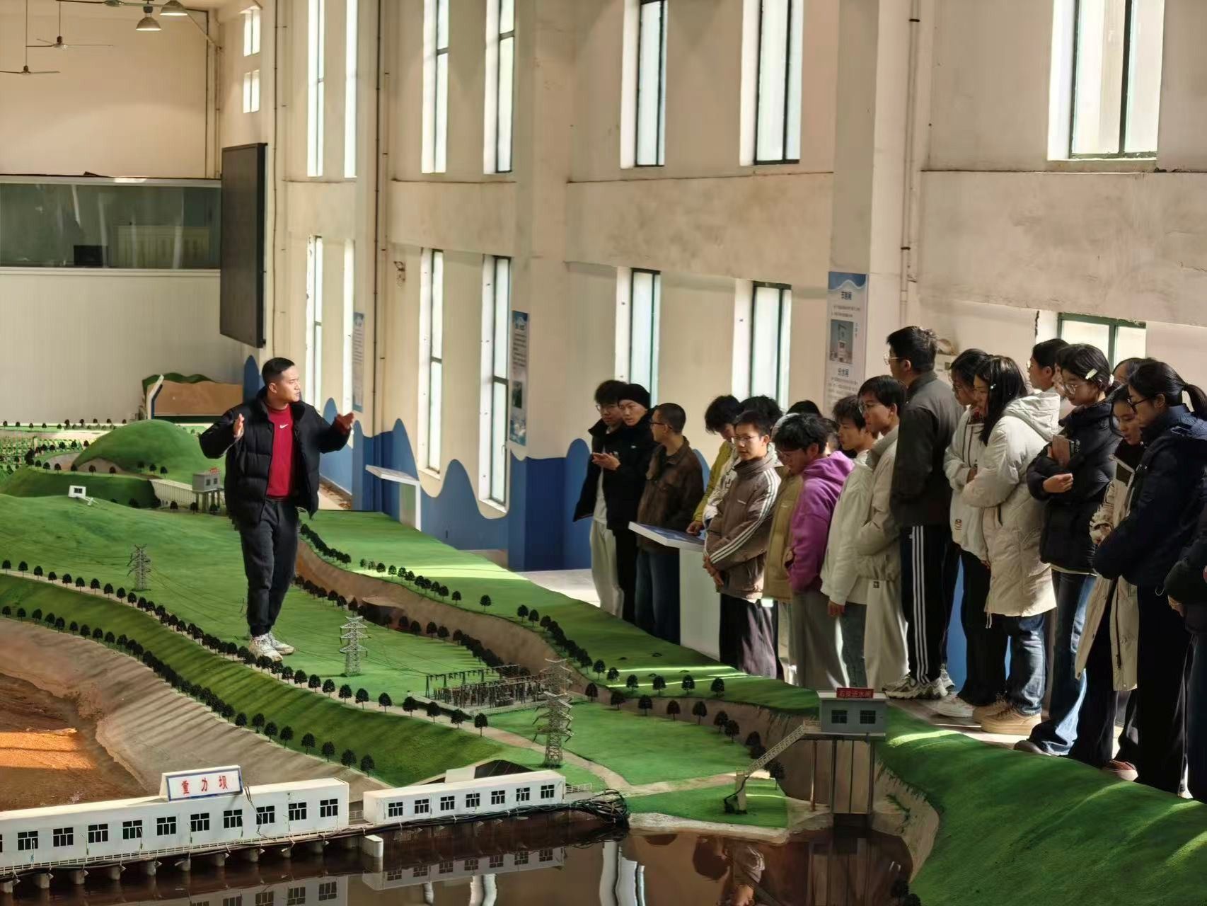 在水工模型大厅,同学们在王寅老师的带领下,有序参观了滚水坝、橡胶坝、重力坝、拱坝、土石坝等多种类型的水工模型。讲解过程中,王寅老师结合模型实物,详细介绍了各类水工建筑物的结构特点与适用场景,重点阐释了重力坝、土石坝与拱坝的设计原理与工程优势,并以三峡大坝这一著名水利工程为例,让同学们直观理解重力坝的实际应用价值。此外,老师还系统讲解了水流在不同水工建筑物前的运动规律,以及水力发电的完整流程与核心技术要点,帮助同学们深化了对专业知识的认知与理解。