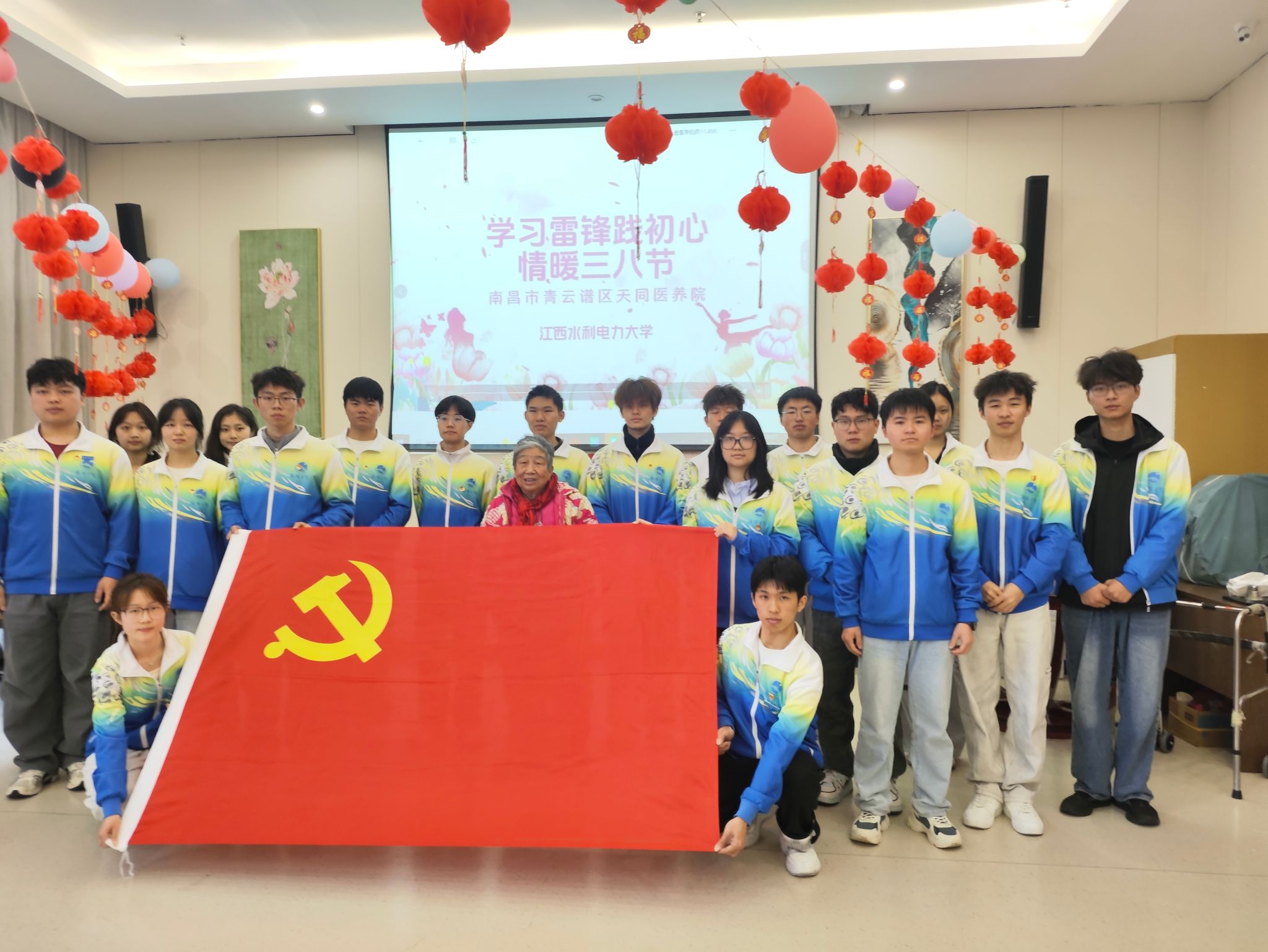 2026年3月8日,瑶湖学院学生党支部党员及入党积极分子前往南昌天同医养院,开展了“践行雷锋精神,情暖医养家园”主题党日志愿服务活动。此次活动旨在弘扬“奉献、友爱、互助、进步”的志愿精神,为医养院的老人们送去温暖与陪伴,同时增强青年党员的社会责任感。